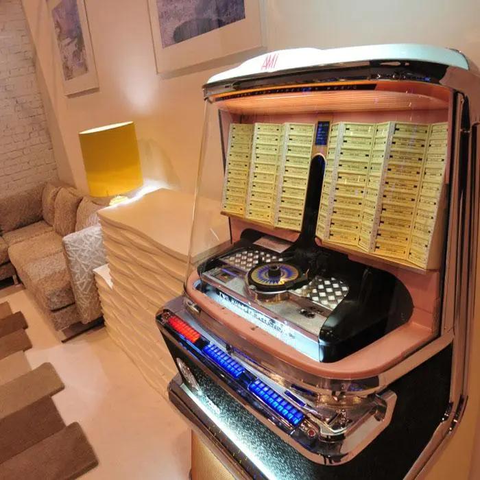 Featuring a selection of 100 45-rpm vinyl records, the AMI H Jukebox allows you to curate your own playlist from a vast library of classic hits spanning various genres – from rock 'n' roll to jazz to rhythm and blues. Simply choose your record, make your selection and watch as the jukebox gracefully springs into action, filling the room with nostalgic rhythms of yesteryear.