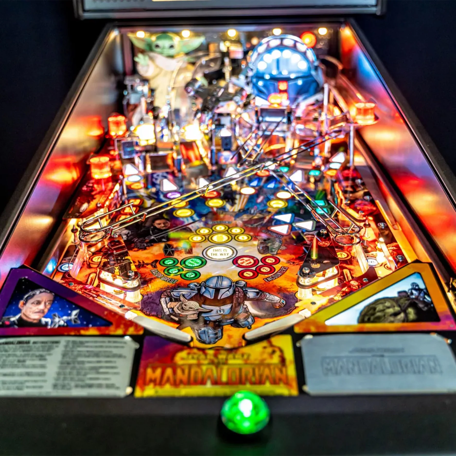 Amongst the special features on the Premium model featured here are a rotating motorised Encounter upper mini playfield with 2 extra flippers and a 'Grogu' Force magnet.