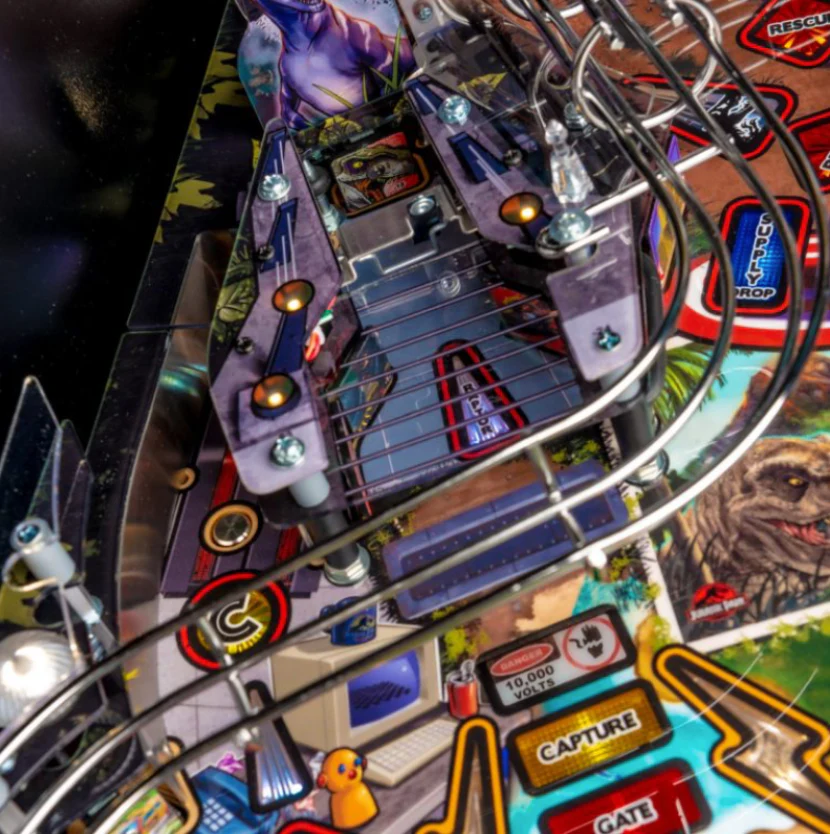 The Pro model features a Jungle Adventure Vehicle target in the middle of the playfield that is a spinning Newton Ball. This kinetic target registers direct hits, determines the direction players navigate on the island during gameplay and lights T. Rex modes. Also included is three full sized flippers, four custom ramps, a spinning “Spitter” target, in-lane up/down lock post that sets up critical playfield shots and distinctive hand-drawn art highlighting iconic dinosaurs from the series.