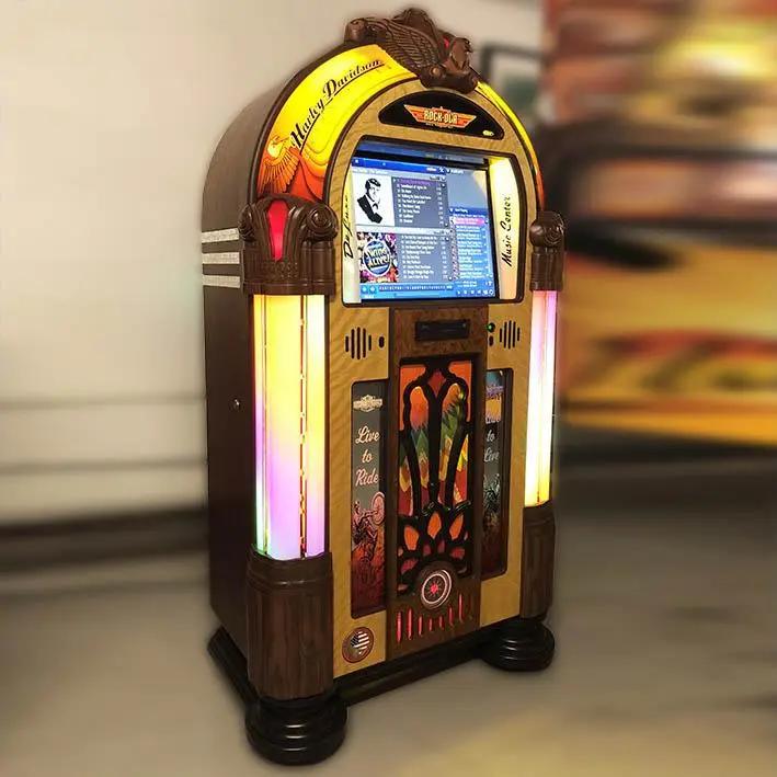 The more digital focus of the Rock-Ola Slimline Music Center jukebox means it is better suited than ever to mobile devices and sophisticated MP3 players, allowing you to download directly from a USB device, sync playlists to your device, or simply play your MP3 directly through the jukebox.